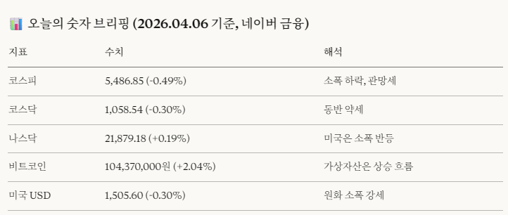 오늘 코스피는 5,486.85로 0.49% 하락, 코스닥도 1,058.54로 0.30% 내리며 양 지수 모두 약세로 마감했습니다. 반면 나스닥은 21,879.18로 소폭 반등했고, 비트코인은 104,370,000원으로 2% 넘게 오르며 가상자산은 온기가 돌았어요.